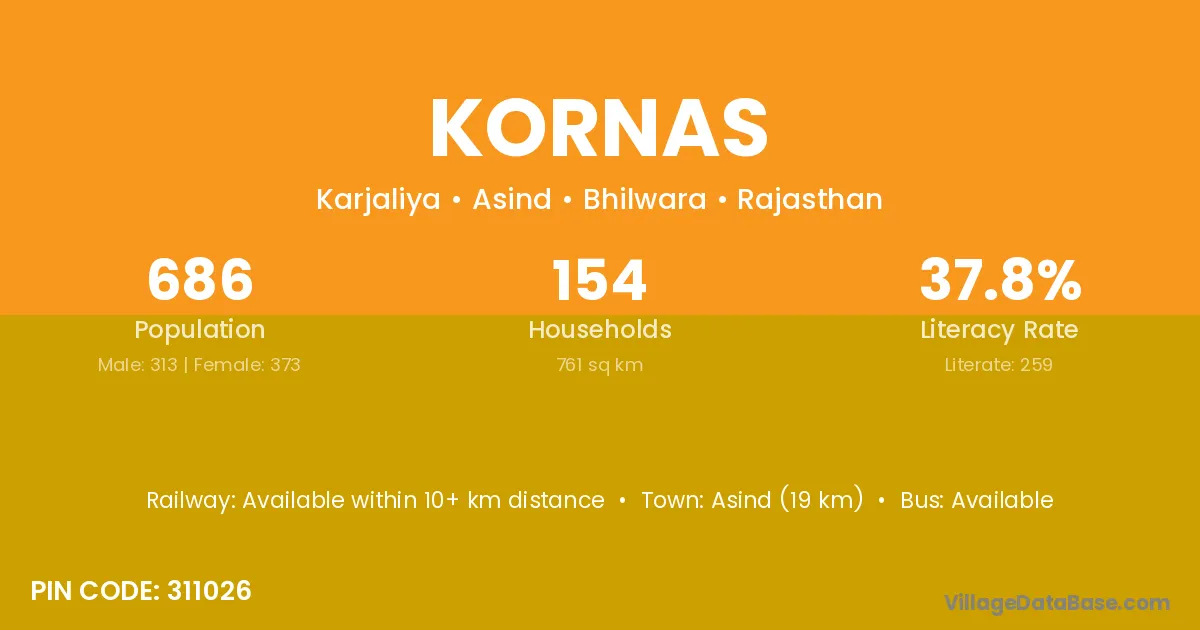 Asind (19 km) is the nearest town to Kornas village for major economic activities and is located approximately 19 km away.
