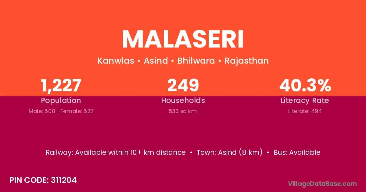 Asind (8 km) is the nearest town to Malaseri village for major economic activities and is located approximately 8 km away.