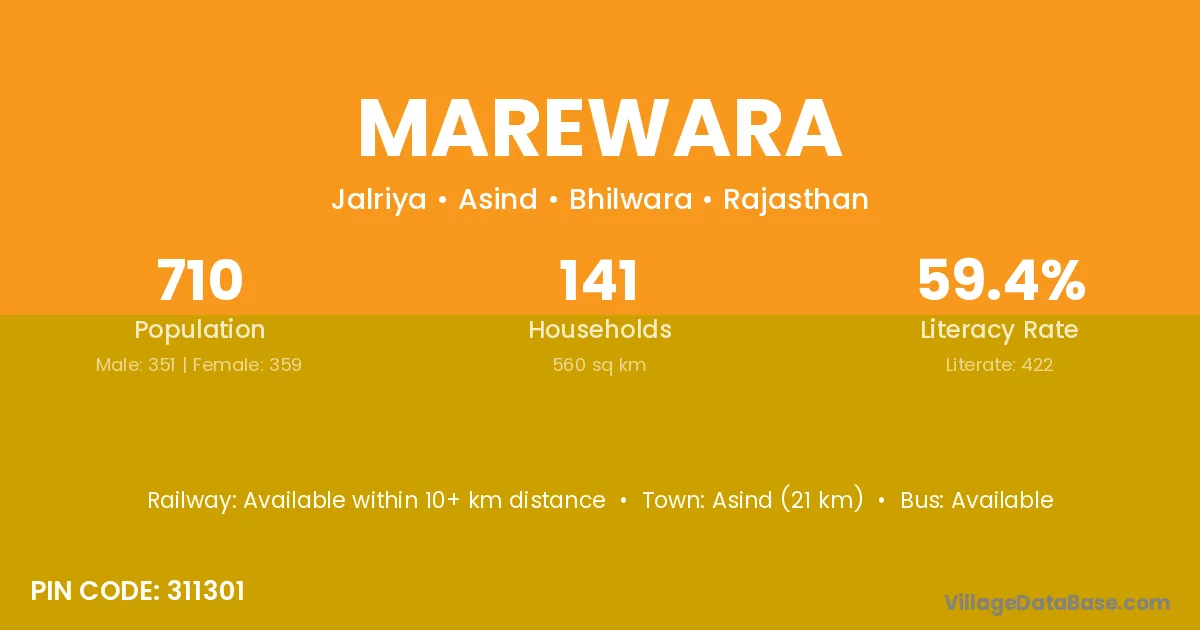 Asind (21 km) is the nearest town to Marewara village for major economic activities and is located approximately 21 km away.