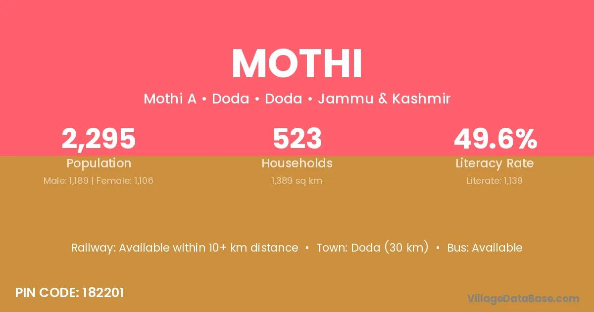 Mothi village has a total population of 1,005 people, of which 501 are males and 504 are females.