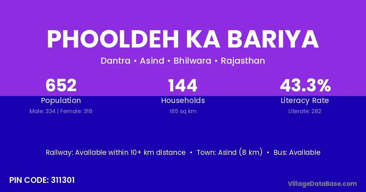 Asind (8 km) is the nearest town to Phooldeh Ka Bariya village for major economic activities and is located approximately 8 km away.