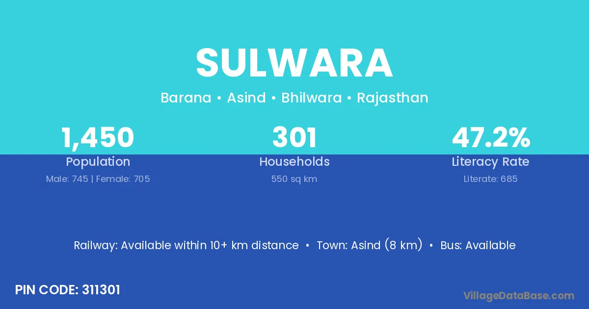 Sulwara village has a total population of 1,450 people, of which 745 are males and 705 are females.