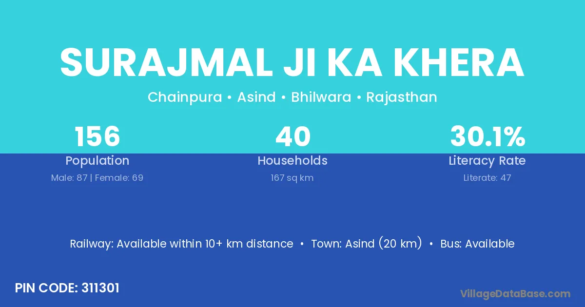Asind (20 km) is the nearest town to Surajmal Ji Ka Khera village for major economic activities and is located approximately 20 km away.