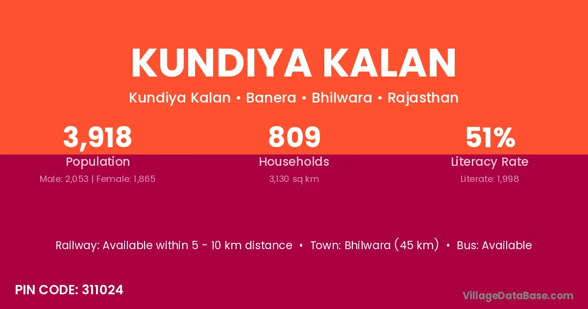 Bhilwara (45 km) is the nearest town to Kundiya Kalan village for major economic activities and is located approximately 45 km away.