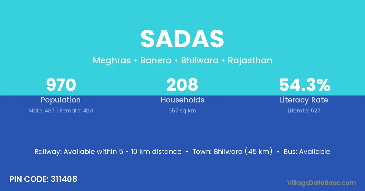Bhilwara (45 km) is the nearest town to Sadas village for major economic activities and is located approximately 45 km away.