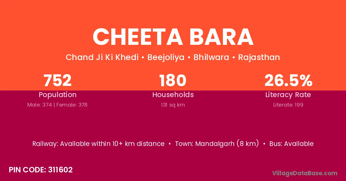 Mandalgarh (8 km) is the nearest town to Cheeta Bara village for major economic activities and is located approximately 8 km away.