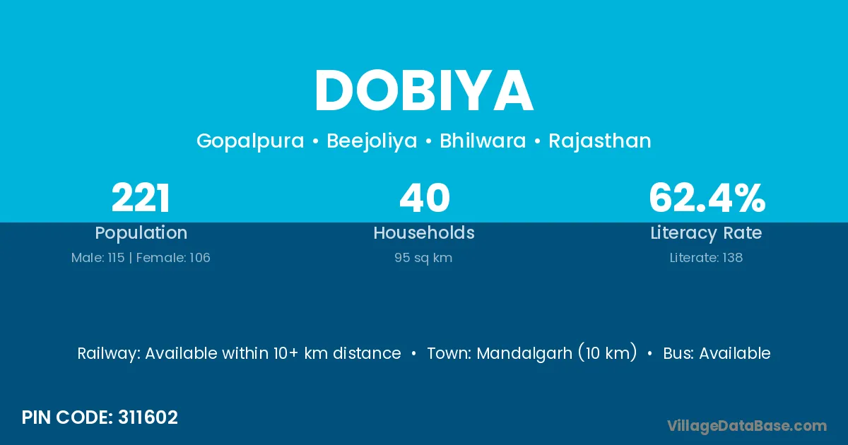 Mandalgarh (10 km) is the nearest town to Dobiya village for major economic activities and is located approximately 10 km away.
