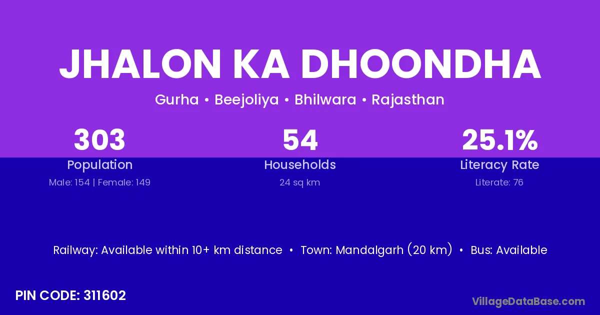 Jhalon Ka Dhoondha village has a total population of 303 people, of which 154 are males and 149 are females.
