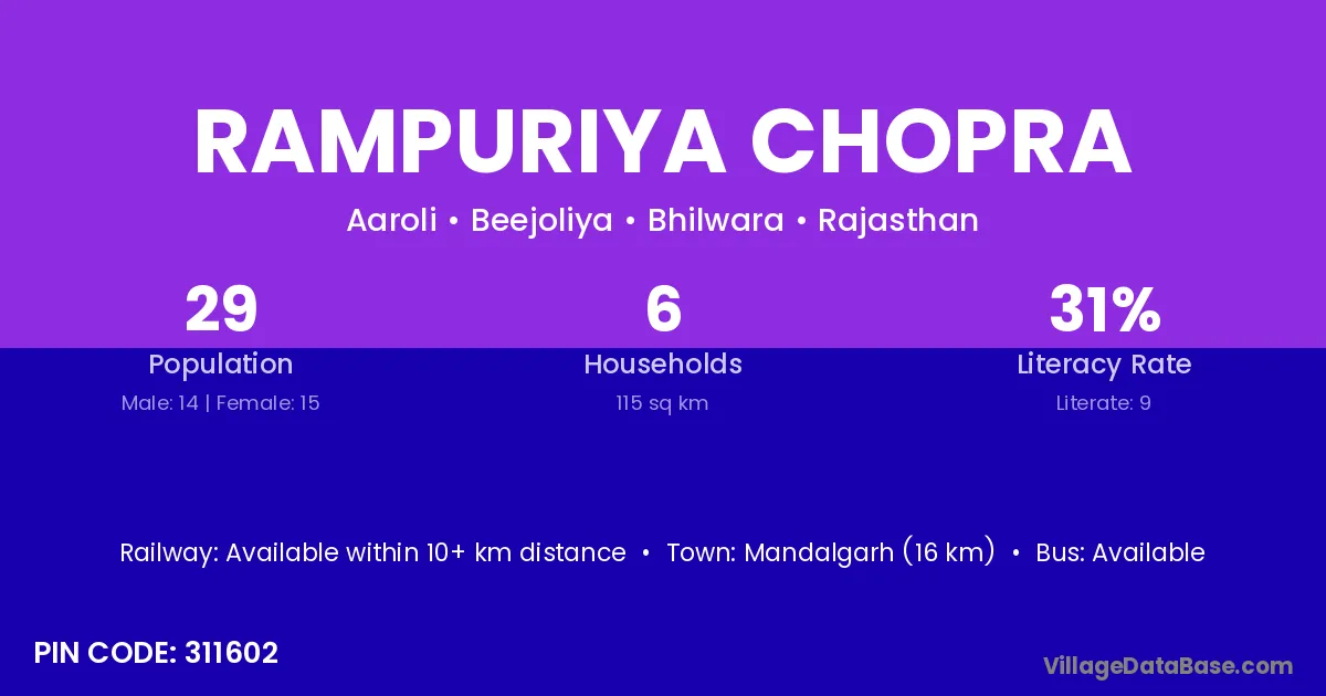 Mandalgarh (16 km) is the nearest town to Rampuriya Chopra village for major economic activities and is located approximately 16 km away.