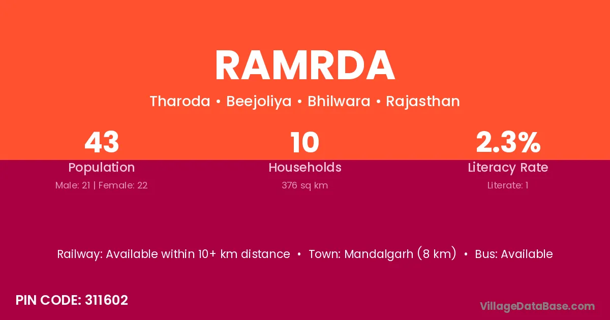 Mandalgarh (8 km) is the nearest town to Ramrda village for major economic activities and is located approximately 8 km away.
