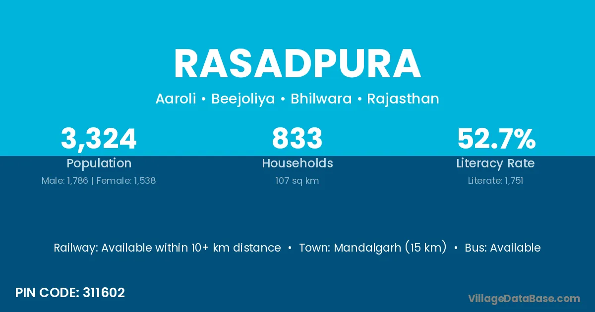 Mandalgarh (15 km) is the nearest town to Rasadpura village for major economic activities and is located approximately 15 km away.