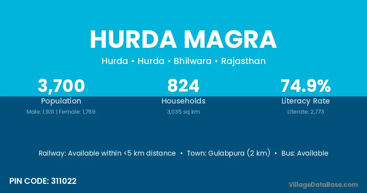 Gulabpura (2 km) is the nearest town to Hurda Magra village for major economic activities and is located approximately 2 km away.