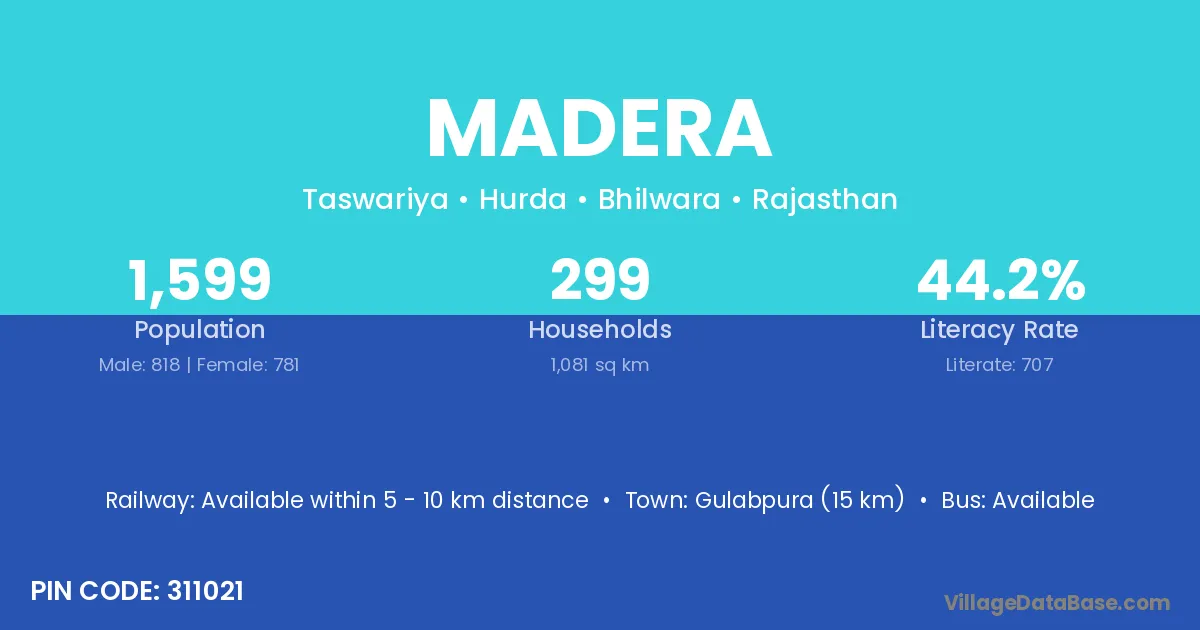 Gulabpura (15 km) is the nearest town to Madera village for major economic activities and is located approximately 15 km away.