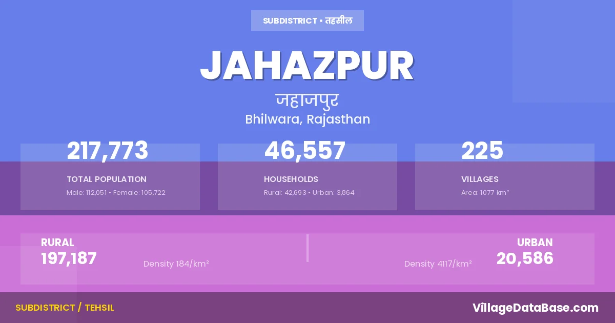 According to the 2011 census The total area of Jahazpur Tehsil is 1077 km², with a population of 217773 people. The population density is 202 inhabitants per square kilometre, and there are approximately 46557 houses in the sub district.