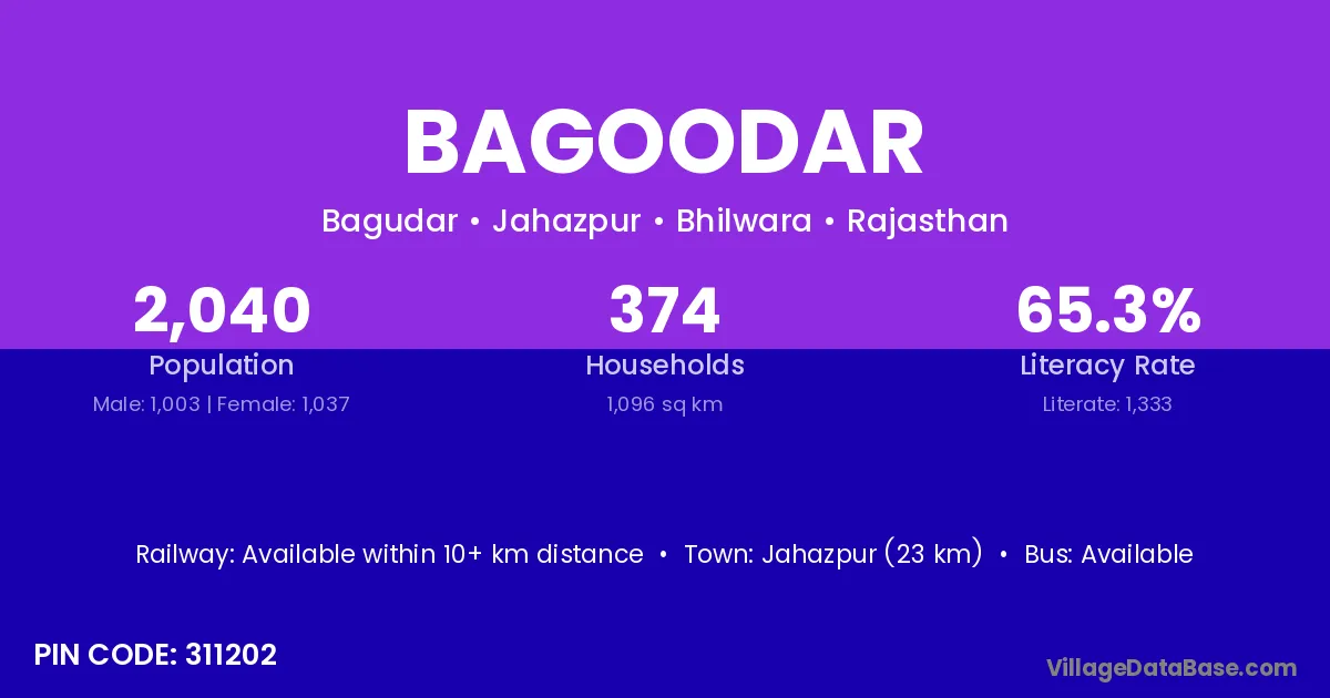 Jahazpur (23 km) is the nearest town to Bagoodar village for major economic activities and is located approximately 23 km away.