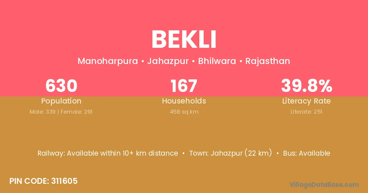 Jahazpur (22 km) is the nearest town to Bekli village for major economic activities and is located approximately 22 km away.