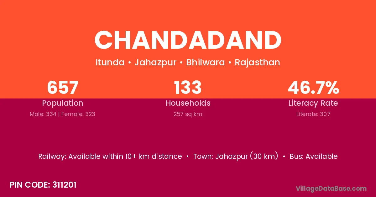 Jahazpur (30 km) is the nearest town to Chandadand village for major economic activities and is located approximately 30 km away.