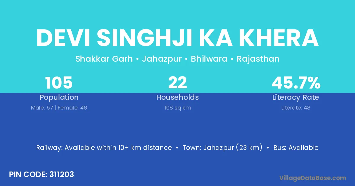 Devi Singhji Ka Khera village has a total population of 105 people, of which 57 are males and 48 are females.