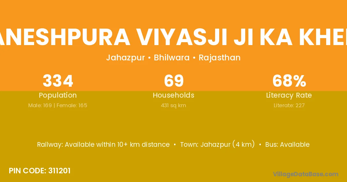 Ganeshpura Viyasji Ji Ka Khera village has a total population of 334 people, of which 169 are males and 165 are females.