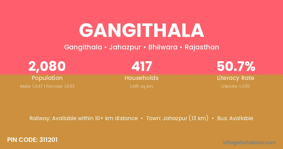 Jahazpur (13 km) is the nearest town to Gangithala village for major economic activities and is located approximately 13 km away.