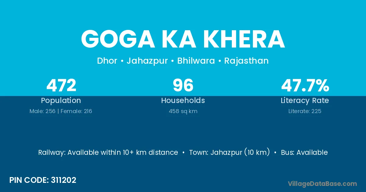 Jahazpur (10 km) is the nearest town to Goga Ka Khera village for major economic activities and is located approximately 10 km away.
