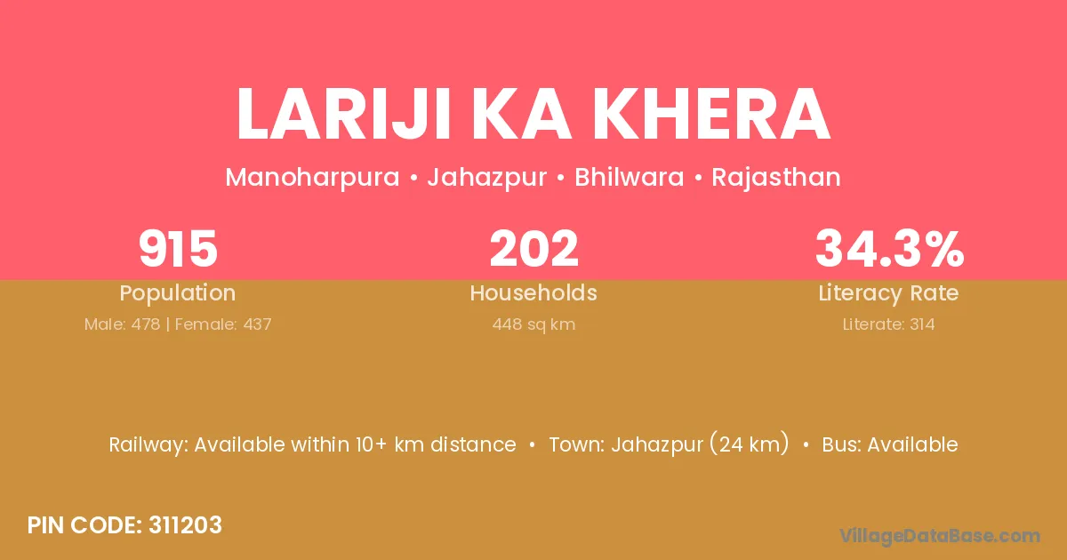 Jahazpur (24 km) is the nearest town to Lariji Ka Khera village for major economic activities and is located approximately 24 km away.