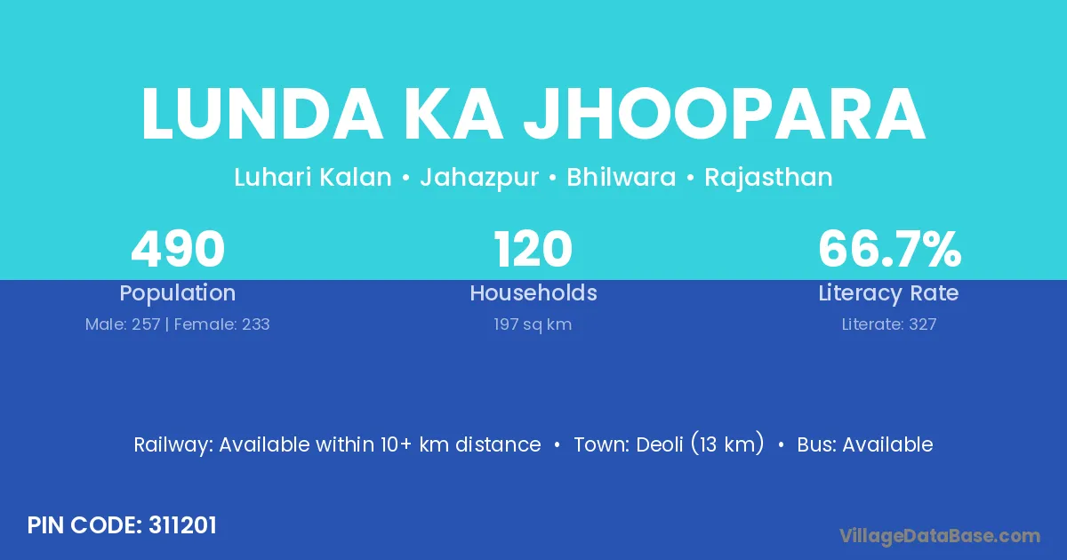 Lunda Ka Jhoopara village has a total population of 490 people, of which 257 are males and 233 are females.