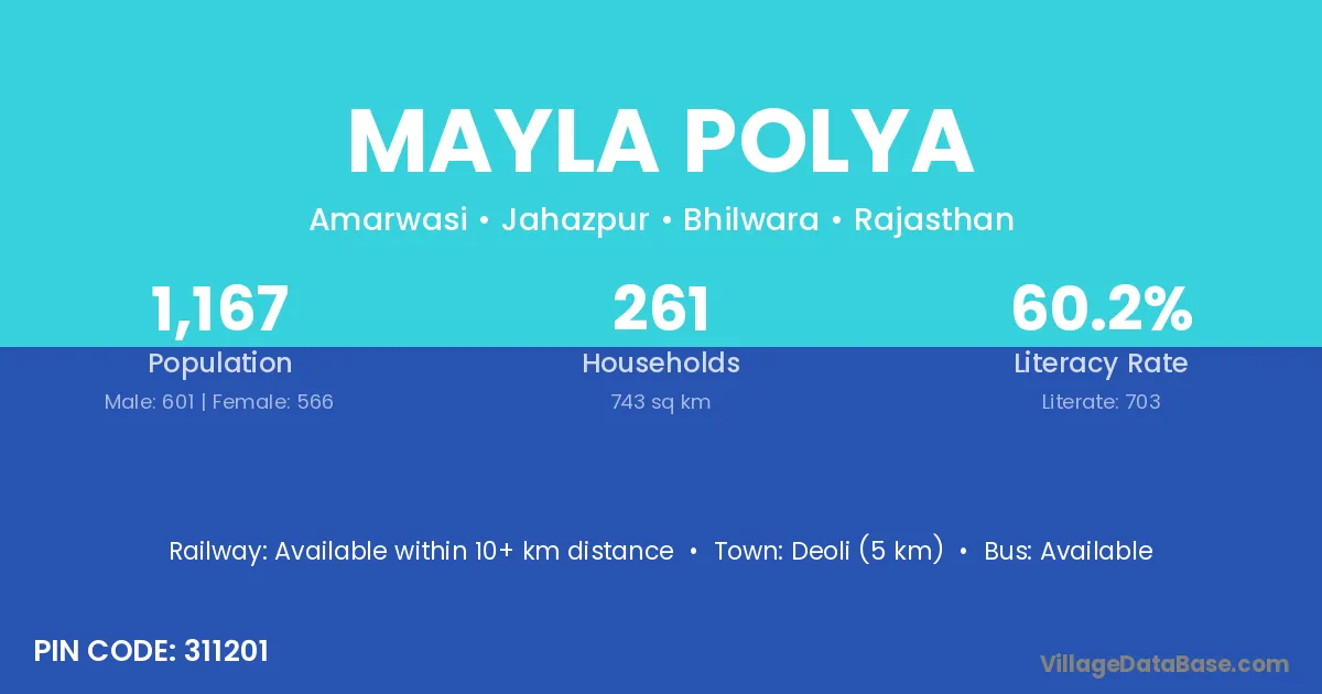 Deoli (5 km) is the nearest town to Mayla Polya village for major economic activities and is located approximately 5 km away.