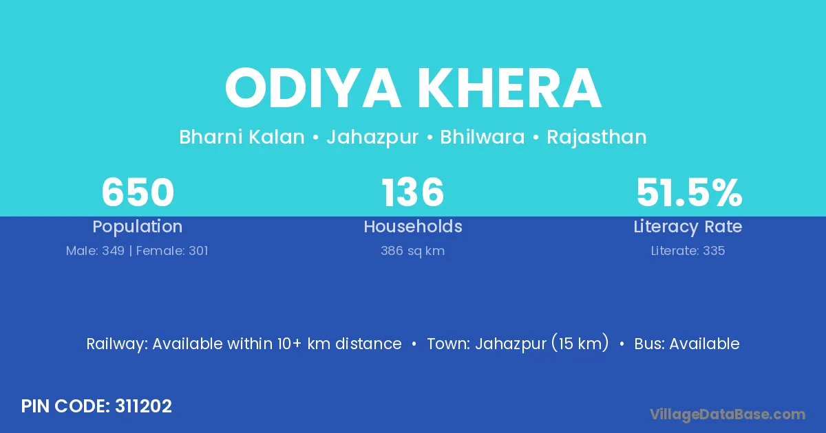 Jahazpur (15 km) is the nearest town to Odiya Khera village for major economic activities and is located approximately 15 km away.