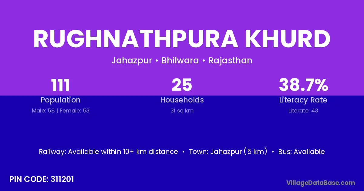 Rughnathpura Khurd village has a total population of 111 people, of which 58 are males and 53 are females.