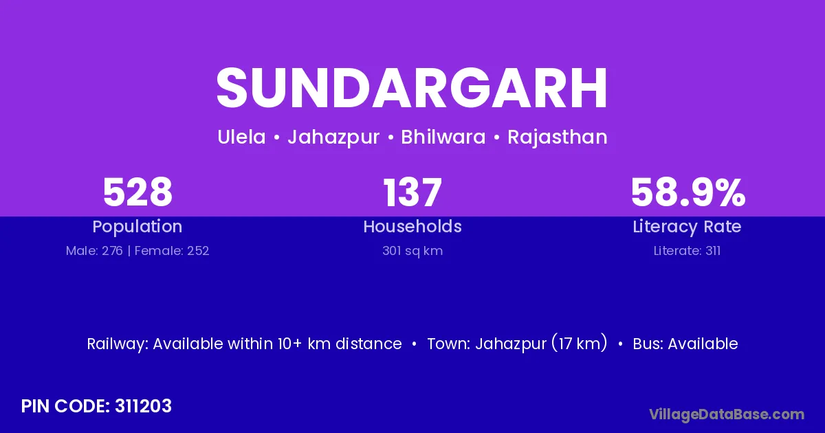 Jahazpur (17 km) is the nearest town to Sundargarh village for major economic activities and is located approximately 17 km away.