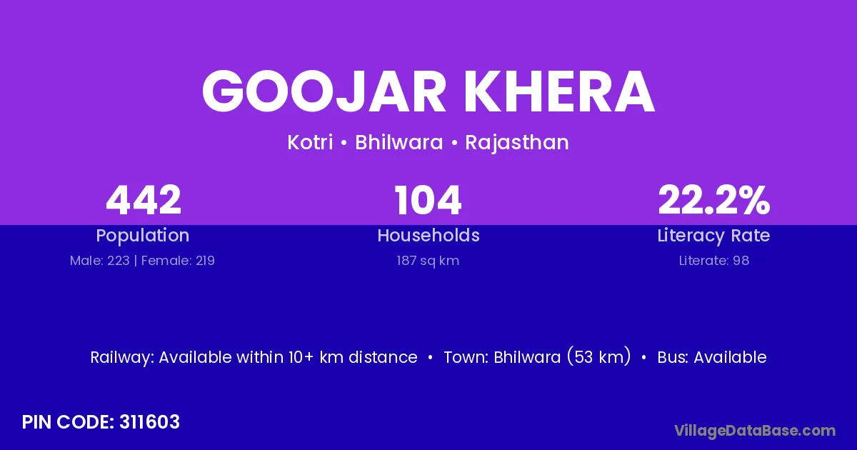 Goojar Khera village has a total population of 442 people, of which 223 are males and 219 are females.