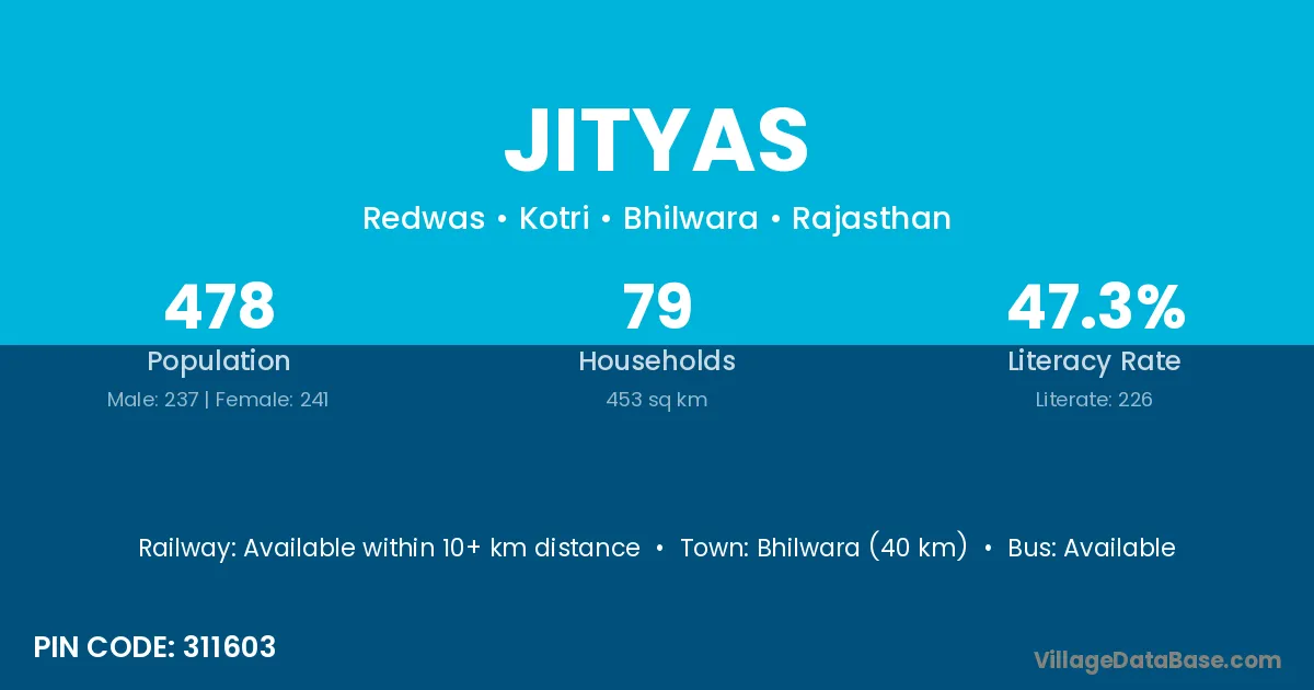 Bhilwara (40 km) is the nearest town to Jityas village for major economic activities and is located approximately 40 km away.