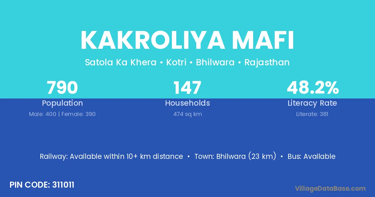 Bhilwara (23 km) is the nearest town to Kakroliya Mafi village for major economic activities and is located approximately 23 km away.