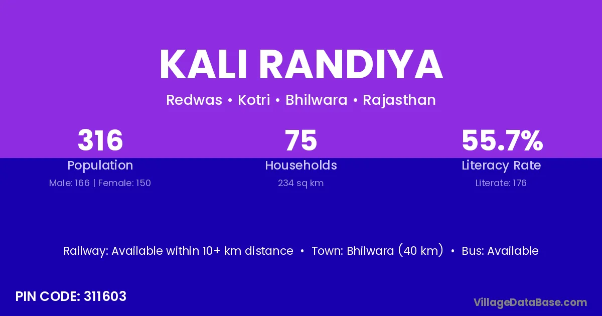 Bhilwara (40 km) is the nearest town to Kali Randiya village for major economic activities and is located approximately 40 km away.