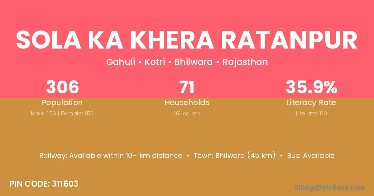 Sola Ka Khera Ratanpur village has a total population of 306 people, of which 153 are males and 153 are females.