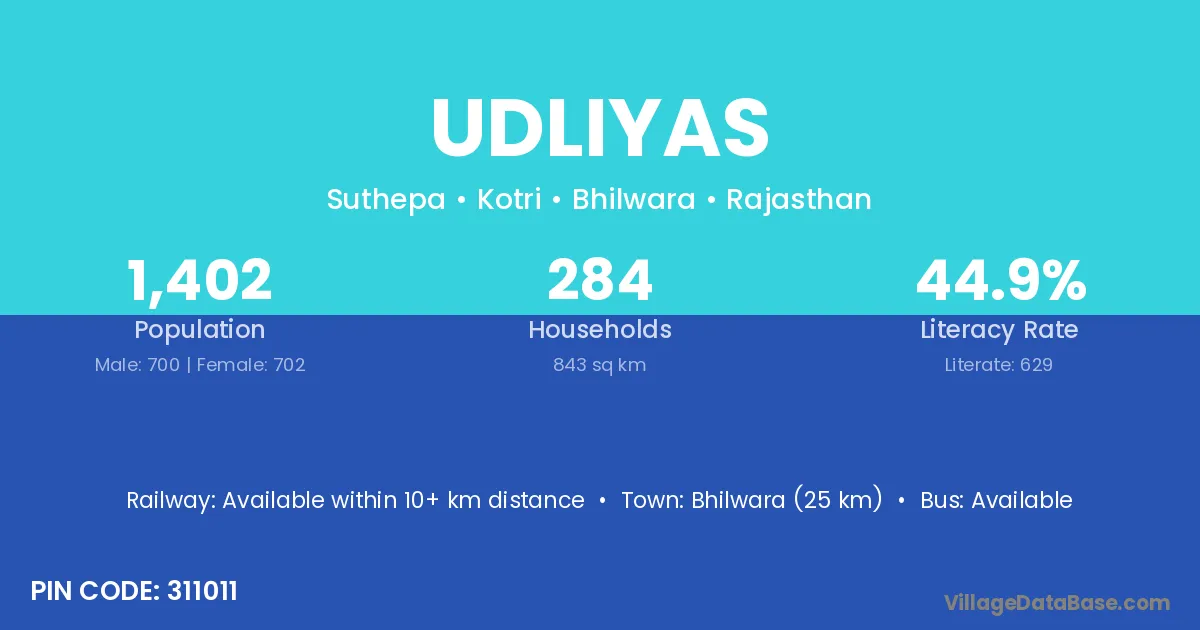 Bhilwara (25 km) is the nearest town to Udliyas village for major economic activities and is located approximately 25 km away.