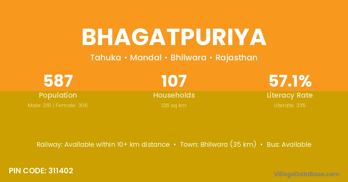 Bhilwara (35 km) is the nearest town to Bhagatpuriya village for major economic activities and is located approximately 35 km away.