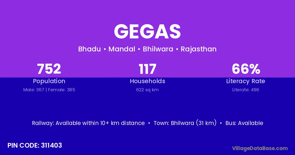 Bhilwara (31 km) is the nearest town to Gegas village for major economic activities and is located approximately 31 km away.