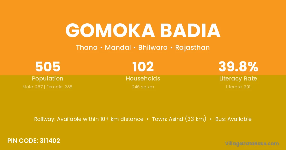 Asind (33 km) is the nearest town to Gomoka Badia village for major economic activities and is located approximately 33 km away.