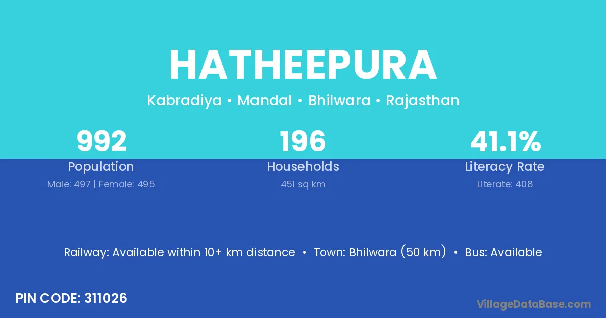 Bhilwara (50 km) is the nearest town to Hatheepura village for major economic activities and is located approximately 50 km away.