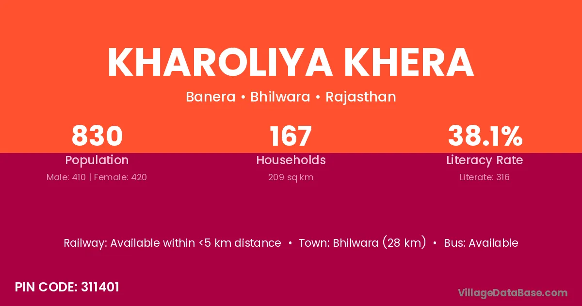 Bhilwara (35 km) is the nearest town to Kharoliya Khera village for major economic activities and is located approximately 35 km away.