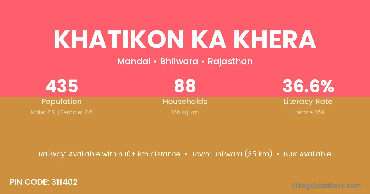 Bhilwara (35 km) is the nearest town to Khatikon Ka Khera village for major economic activities and is located approximately 35 km away.