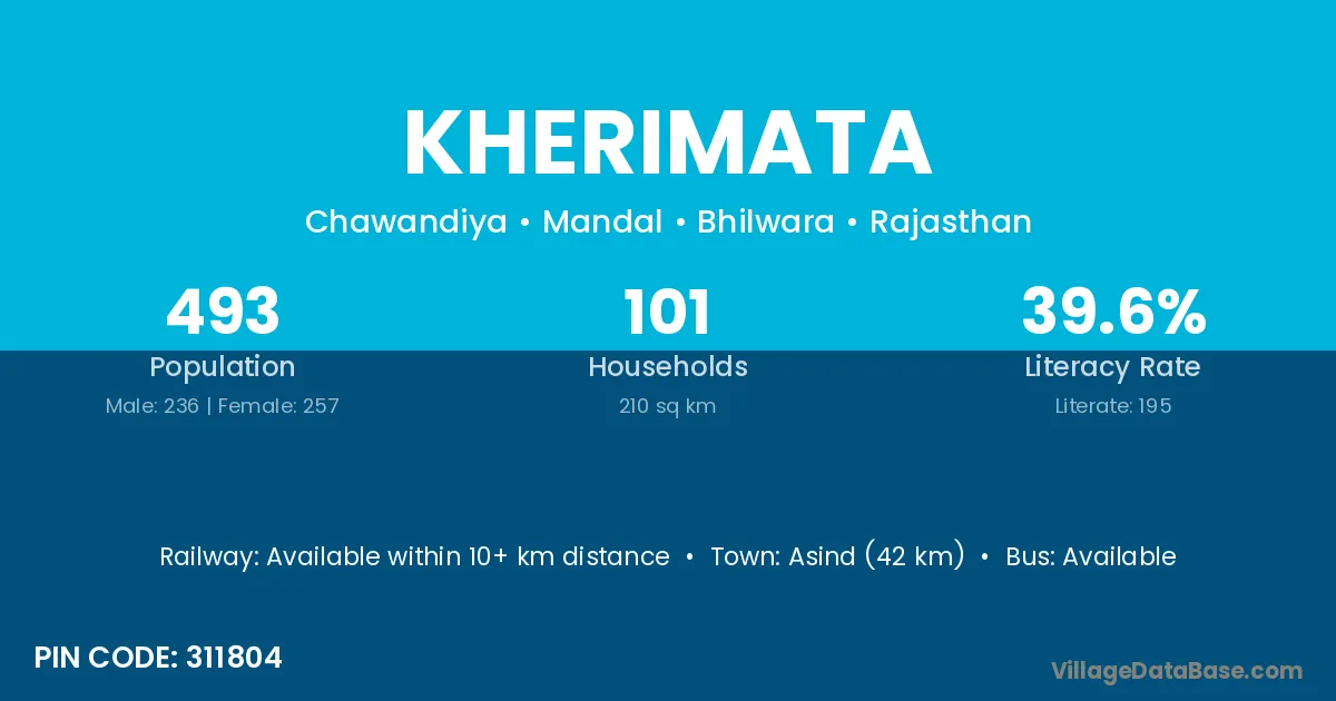 Asind (42 km) is the nearest town to Kherimata village for major economic activities and is located approximately 42 km away.