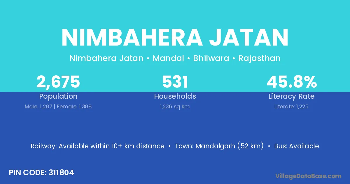Mandalgarh (52 km) is the nearest town to Nimbahera Jatan village for major economic activities and is located approximately 52 km away.