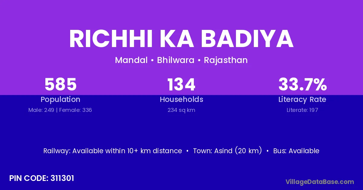 Richhi Ka Badiya village has a total population of 585 people, of which 249 are males and 336 are females.