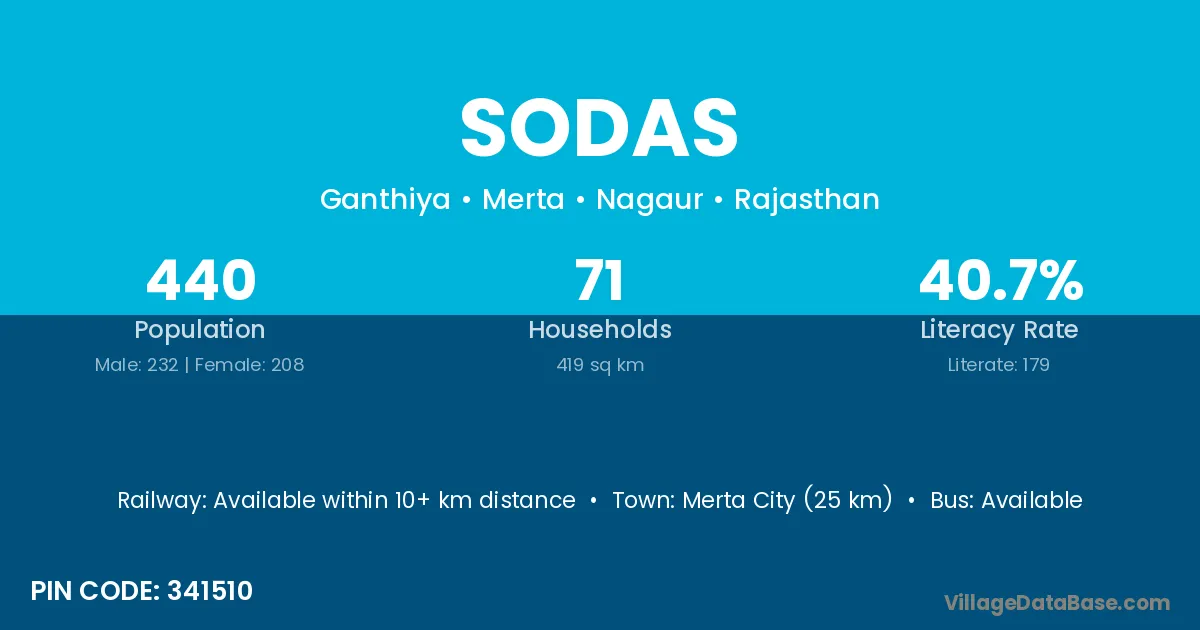 Bhilwara (50 km) is the nearest town to Sodas village for major economic activities and is located approximately 50 km away.