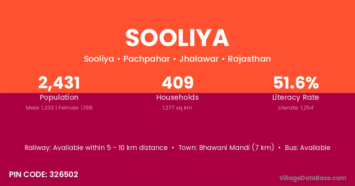 The literacy rate of Sooliya village is 34.05%. Male literacy stands at 47.11% and female literacy at 20.00%.