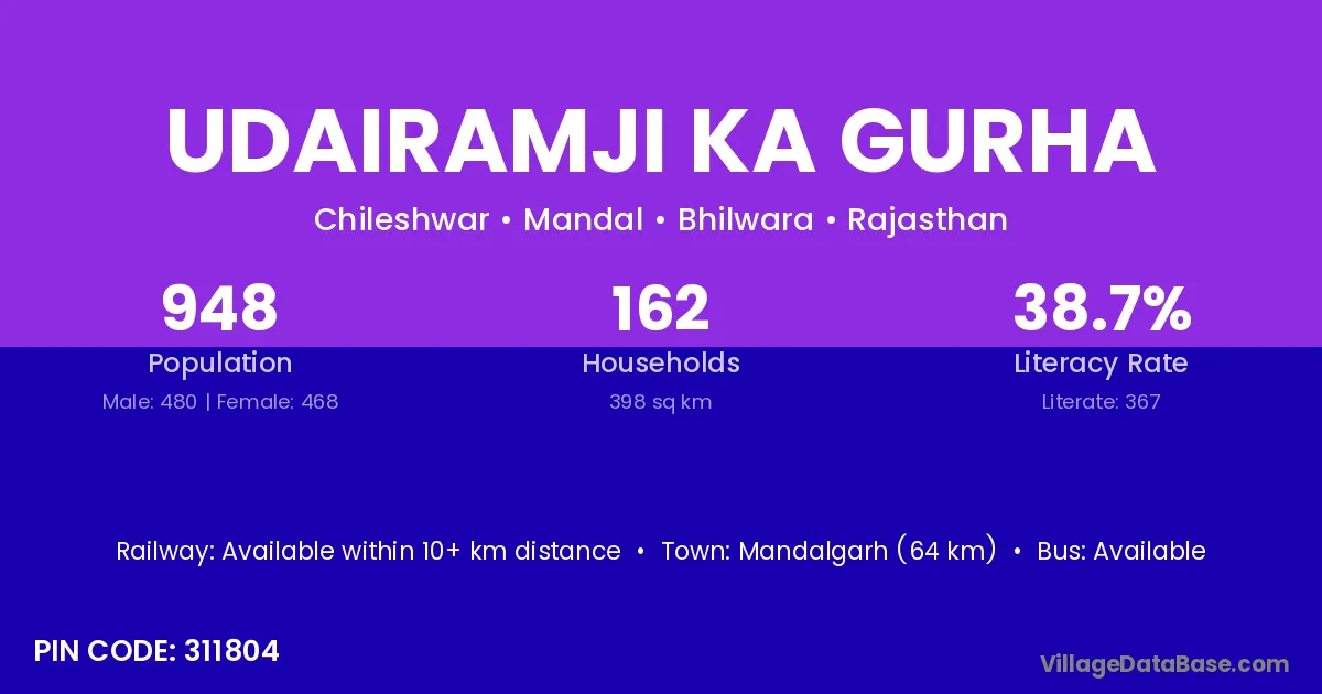 Udairamji Ka Gurha village has a total population of 948 people, of which 480 are males and 468 are females.