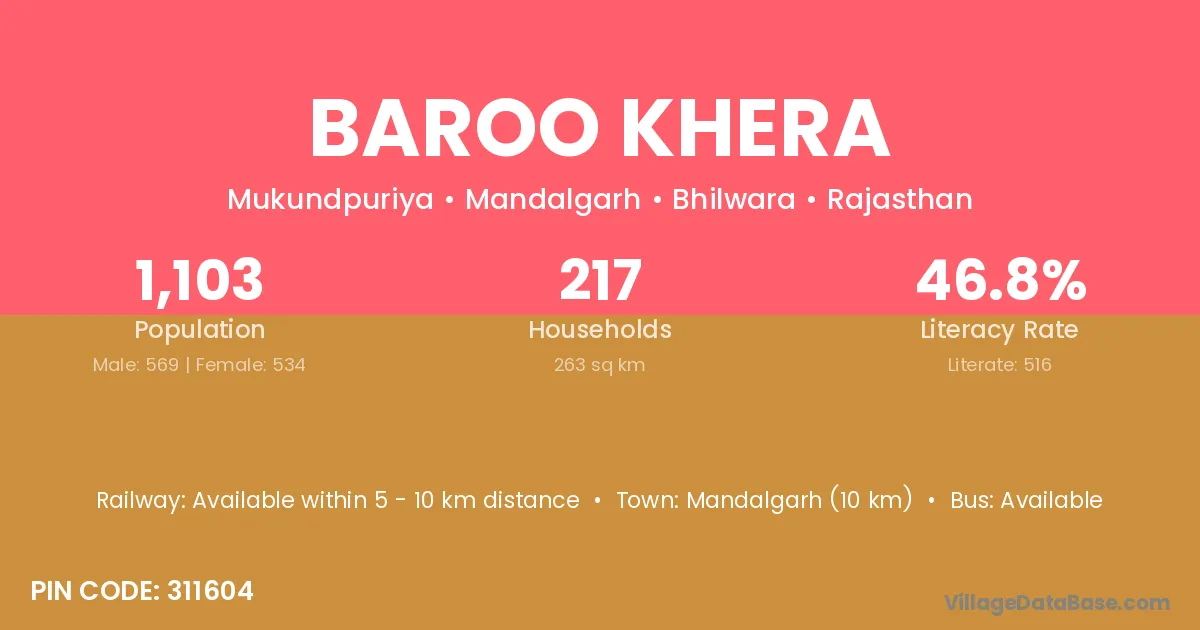 Mandalgarh (10 km) is the nearest town to Baroo Khera village for major economic activities and is located approximately 10 km away.